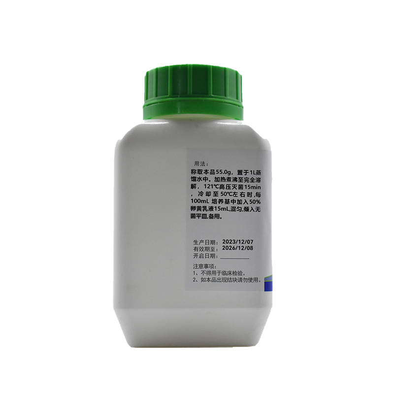 稱取本品 55.0g ,置于 1L 蒸餾水中,加熱煮沸至完全溶解,121℃高壓滅菌 15min ,冷卻至 50℃左右時, 每 100ml 培養(yǎng)基中加入 50%卵黃乳液 15ml,混勻,傾入無菌平皿,備用。