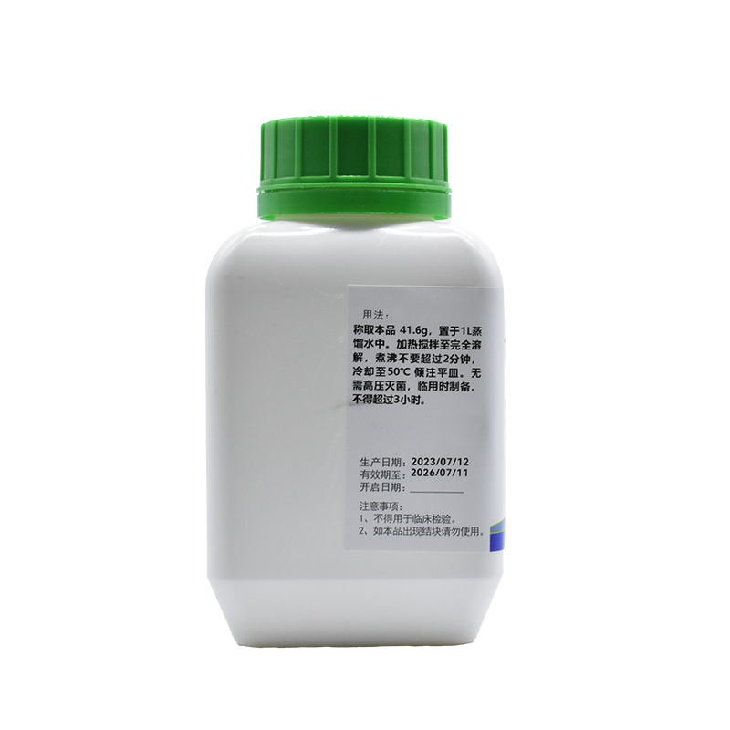 稱取本品 41.6g,置于 1L 蒸餾水中。加熱攪拌至完全溶解,煮沸不要超過 2 分鐘,冷卻至 50 ° ℃傾注平皿。 無需高壓滅菌,臨用時(shí)制備,不得超過 3 小時(shí)。