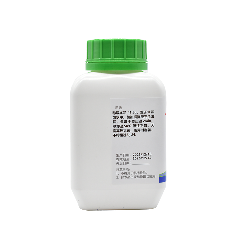 稱取本品41.5g,置于1L蒸餾水中。加熱攪拌至完全溶解,煮沸不要超過2min,冷卻至50℃傾注平皿。無需高壓滅菌,臨用時(shí)制備,不得超過3小時(shí)。