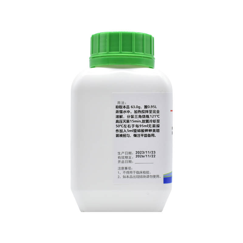 稱取本品 63.0g,置0.95L蒸餾水中。加熱攪拌至完全溶解,分裝三角燒瓶121℃ 高壓滅菌15min,放置冷卻至50℃左右于每95ml無菌操作加入5ml亞碲酸鉀卵黃增菌液搖勻,傾注平皿備用。