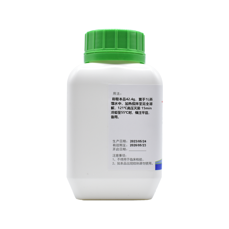 稱取本品42.4g,置于1L蒸餾水中,加熱攪拌至完全溶解,121℃高壓滅菌 15min冷卻至55℃時,傾注平皿,備用。