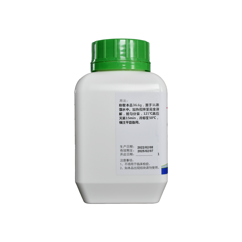 稱取本品36.6g,置于1L蒸餾水中。加熱攪拌至完全溶解,攪勻分裝,121℃ 高壓滅菌20min,冷卻至50℃,傾注平皿備用。